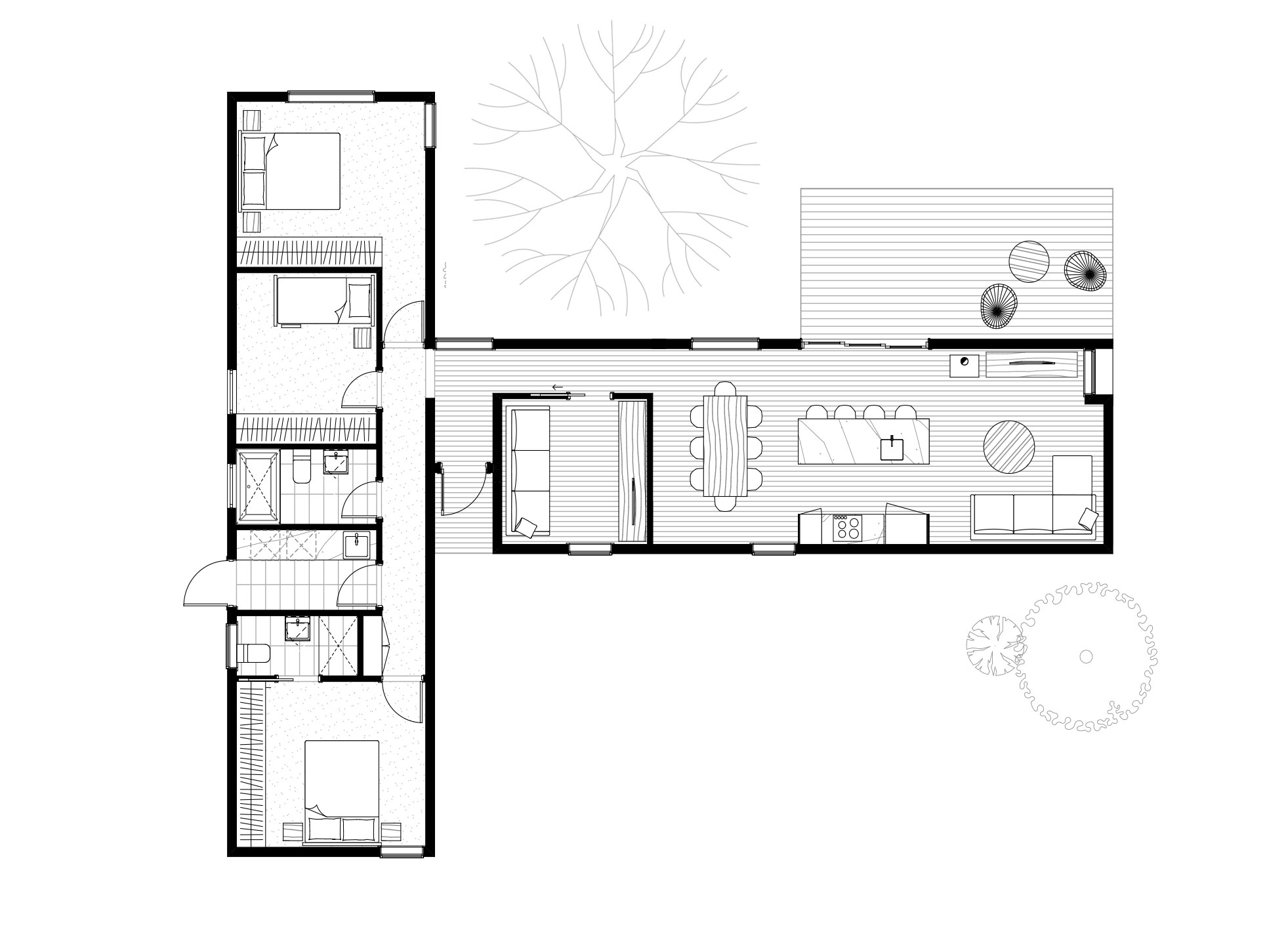 Two interconnecting modules create “the knuckle” a joining interface that becomes the formal entrance between the private and communal zones. The generous open plan kitchen with central island bench/living area welcomes an abundance of natural light and provides a beautiful space to connect over meals and feel safe knowing you can keep an eye on the kids playing outside. An additional secluded living room or study creates a relaxing area away from the main living zone. With the right orientation, this home captures clever passive solar gains to keep a comfortable temperature throughout the year.